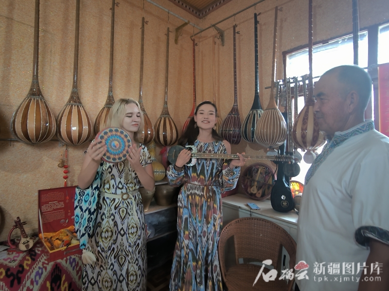 7月28日,在新和縣依其艾日克鎮(zhèn)加依村,俄羅斯籍網(wǎng)絡(luò)達人梅麗莎(左)和網(wǎng)絡(luò)名人古麗皮亞·買買提依明(中)正在體驗民間手工樂器。石榴云/新疆日報記者 甘興華攝