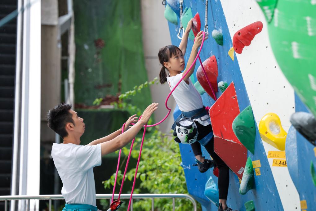 圖為在深圳福田區(qū)呢度有家攀巖館,來(lái)自中國(guó)香港的9歲女孩何芊芊(右)在爸爸何善揮的保護(hù)下開始難度攀巖訓(xùn)練(6月17日攝)。新華社記者 梁旭 攝