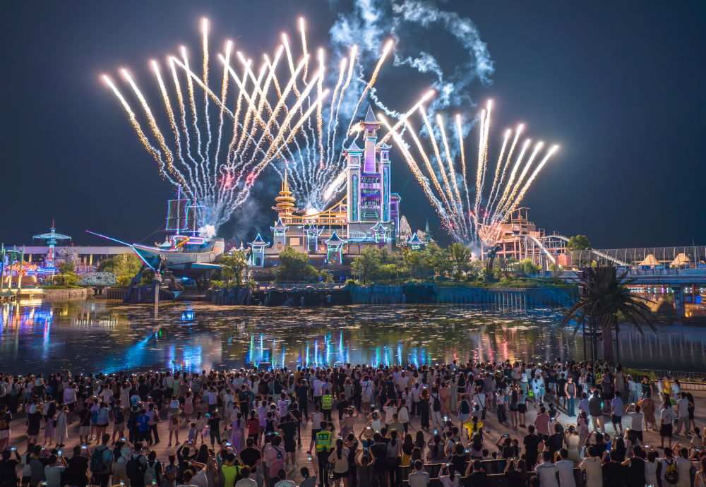 7月19日,在湖北省襄陽(yáng)市華僑城奇幻谷,游客觀看大型夜間演藝秀《奇幻城堡光影秀》(無(wú)人機(jī)照片)。新華社發(fā)(楊東 攝)