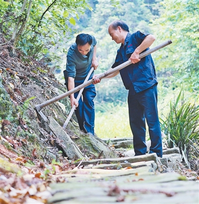 每次上山修路,陳興海和弟弟陳興合都會(huì)帶上鐵鍬、鎬頭、鋤頭、斧頭?!笆^硬得很,我一鎬頭下去,手震得疼!”這樣的日子,兄弟倆一過(guò)就是8年??傞L(zhǎng)約15公里的古道,已經(jīng)修好了約2/3?!拔覀冞€要繼續(xù)往下修?!标惻d海說(shuō)。