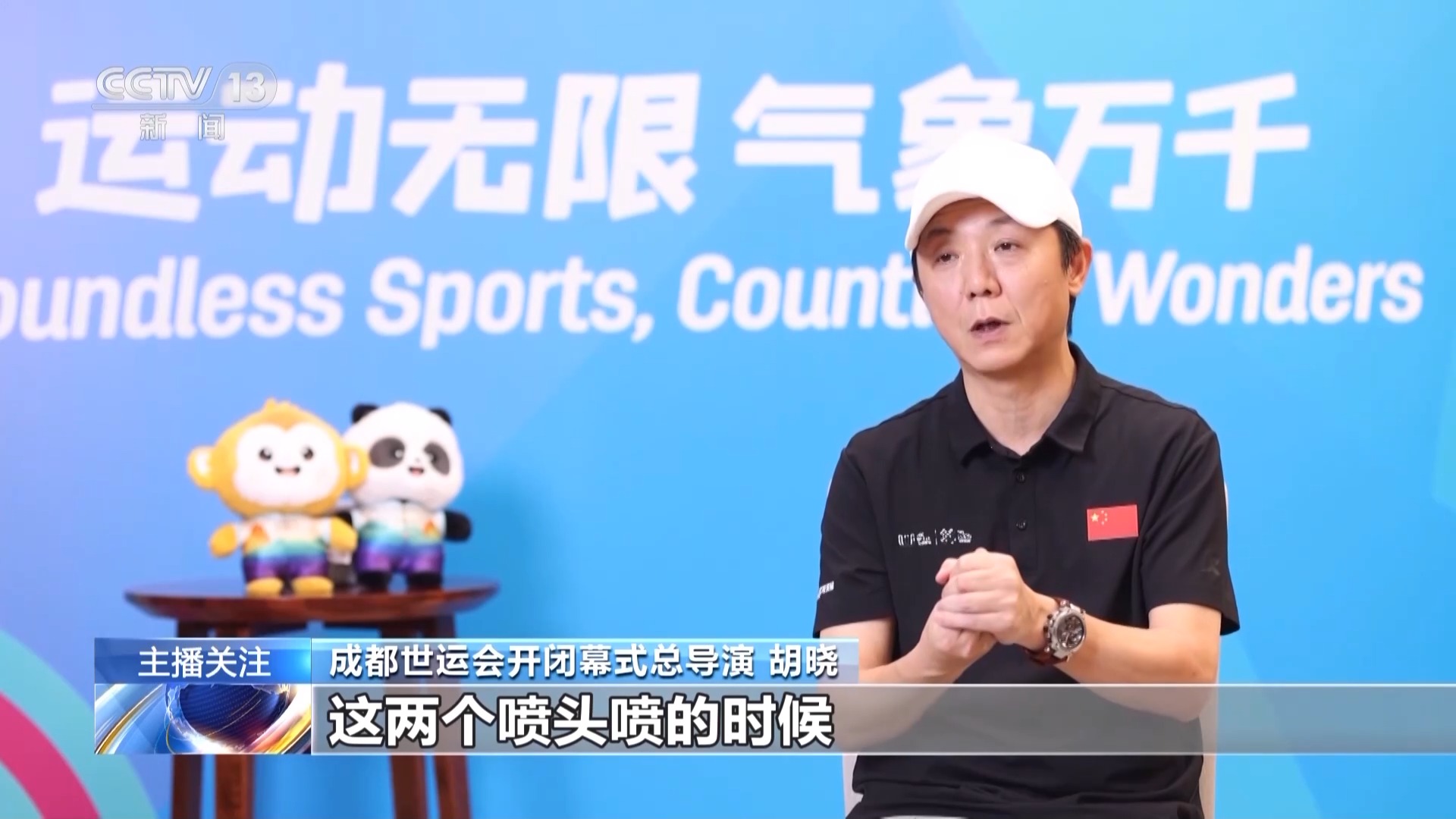 成都世運(yùn)會(huì)開閉幕式總導(dǎo)演 胡曉:乍一看都以為是里面加了個(gè)燃?xì)夤艿馈2皇?,它真的把天然氣融到水里去了。它是外面一根水管,里面一根氣管,這兩個(gè)噴頭噴的時(shí)候,外面的水管因?yàn)樗膲毫芫鶆?,而且足夠大,可以形成一個(gè)管壁,變成一個(gè)天然氣管道,氣就從里面出來了,而這個(gè)氣又不能太大,太大了他又把水管壁給沖破了,太小了,又沖不上去,就要找到一個(gè)水與火之間的平衡,然后在最后點(diǎn)著的瞬間,水跟火都能融到一起去燃燒,去綻放,一個(gè)噴起來,一個(gè)燃燒起來。
