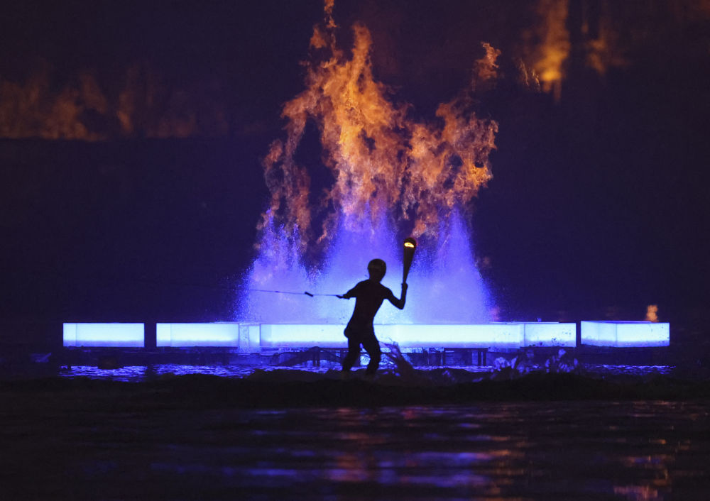 此次開幕式進(jìn)行了世運(yùn)會歷史上第一次主火炬點燃儀式,主創(chuàng)團(tuán)隊經(jīng)過多輪研討,采取火在噴泉中燃燒作為主要創(chuàng)意點,通過精心設(shè)計,讓天然氣向上穿過水柱,實現(xiàn)節(jié)能燃燒。