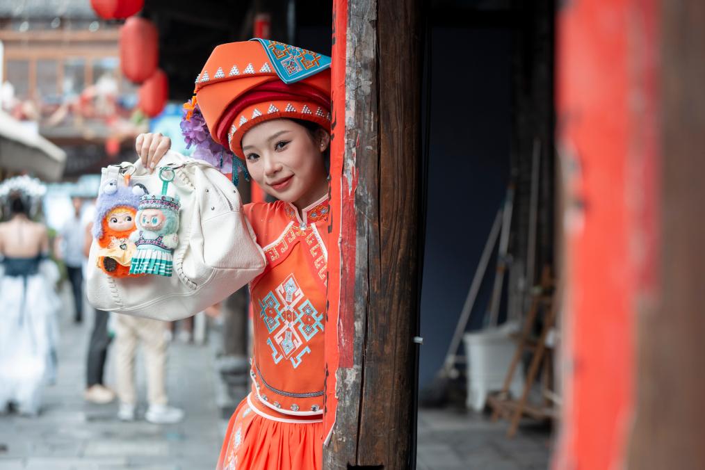 7月8日,在湖北省恩施土家族苗族自治州,一名穿著土家傳統(tǒng)民族服飾的女子在展示穿上西蘭卡普的拉布布。新華社記者 伍志尊 攝