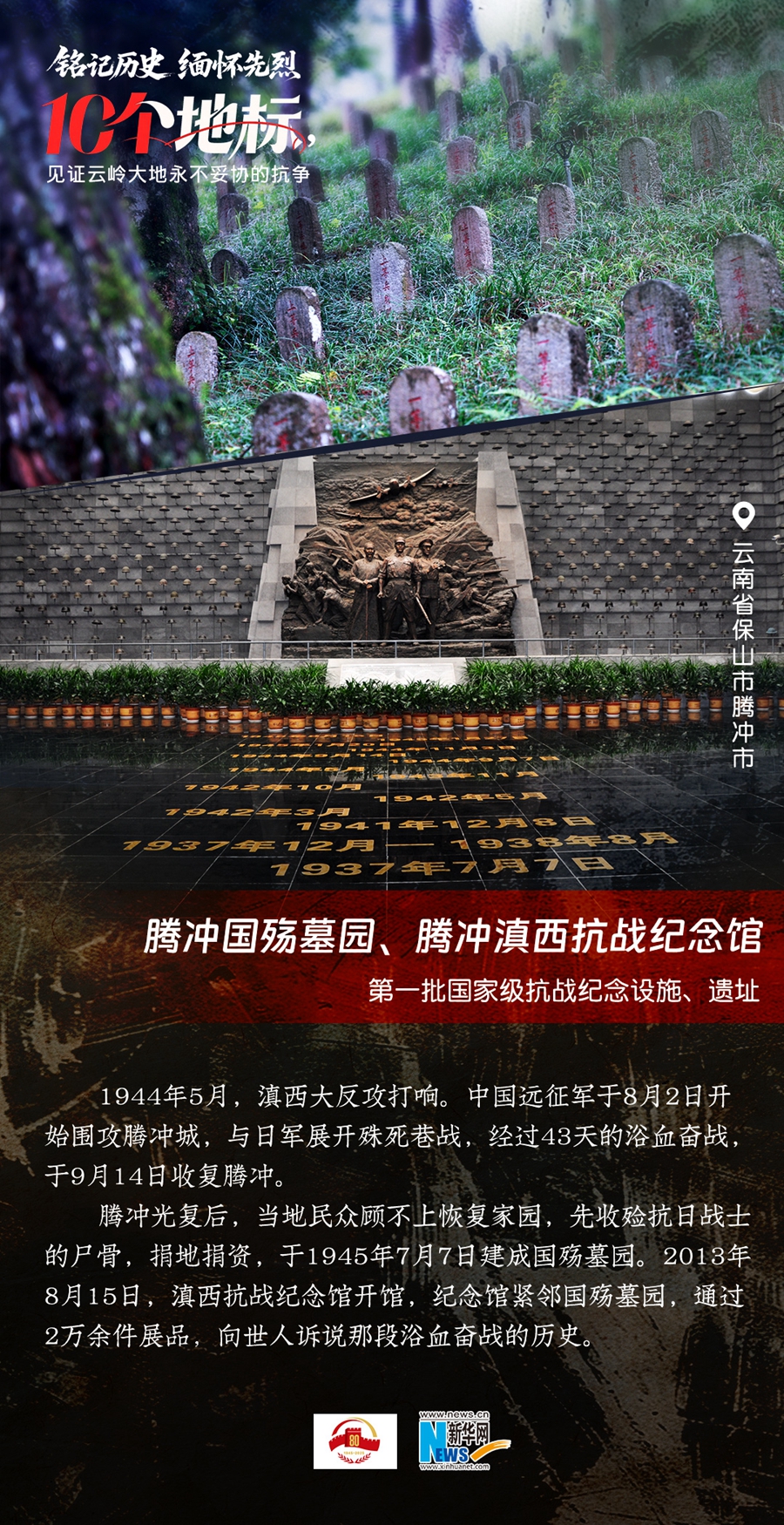??80年過去,曾經(jīng)的戰(zhàn)場硝煙雖散,但英氣永存。在國務(wù)院公布的前三批國家級抗戰(zhàn)紀(jì)念設(shè)施、遺址名錄中,云南省共有10個(gè),分別為騰沖國殤墓園、騰沖滇西抗戰(zhàn)紀(jì)念館,龍陵抗日戰(zhàn)爭紀(jì)念館,國立西南聯(lián)合大學(xué)舊址,抗戰(zhàn)勝利紀(jì)念堂,松山戰(zhàn)役舊址,南洋華僑機(jī)工回國抗日紀(jì)念碑,怒江駝峰航線紀(jì)念館,施甸縣抗日江防遺跡群,滇緬公路惠通橋,滇西抗日戰(zhàn)爭紀(jì)念碑。它們承載著國人共同的歷史記憶與民族情感,也為我們學(xué)習(xí)和傳承抗戰(zhàn)精神提供了現(xiàn)實(shí)條件。