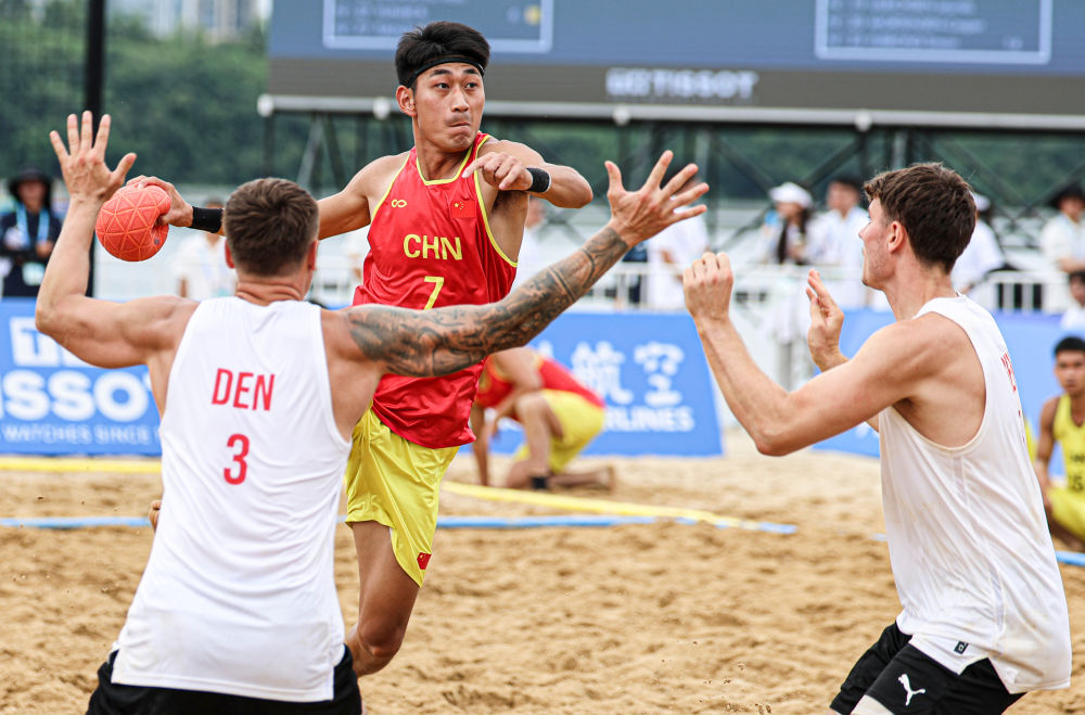 8月11日,中國(guó)隊(duì)球員任健豪(上)在比賽中進(jìn)攻。當(dāng)日,在2025年成都世運(yùn)會(huì)沙灘手球男子第5-8名安慰賽半決賽中,中國(guó)隊(duì)0比2不敵丹麥隊(duì)。新華社記者 劉坤 攝