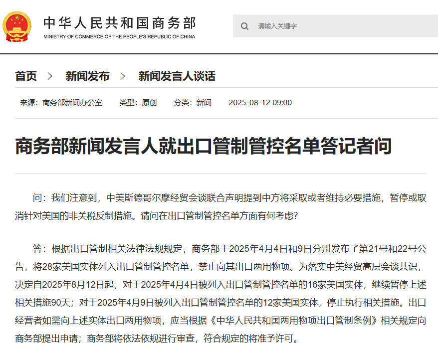 答:根據(jù)出口管制相關(guān)法律法規(guī)規(guī)定,商務(wù)部于2025年4月4日和9日分別發(fā)布了第21號和22號公告,將28家美國實(shí)體列入出口管制管控名單,禁止向其出口兩用物項(xiàng)。為落實(shí)中美經(jīng)貿(mào)高層會(huì)談共識(shí),決定自2025年8月12日起,對于2025年4月4日被列入出口管制管控名單的16家美國實(shí)體,繼續(xù)暫停上述相關(guān)措施90天;對于2025年4月9日被列入出口管制管控名單的12家美國實(shí)體,停止執(zhí)行相關(guān)措施。出口經(jīng)營者如需向上述實(shí)體出口兩用物項(xiàng),應(yīng)當(dāng)根據(jù)《中華人民共和國兩用物項(xiàng)出口管制條例》相關(guān)規(guī)定向商務(wù)部提出申請;商務(wù)部將依法依規(guī)進(jìn)行審查,符合規(guī)定的將準(zhǔn)予許可。