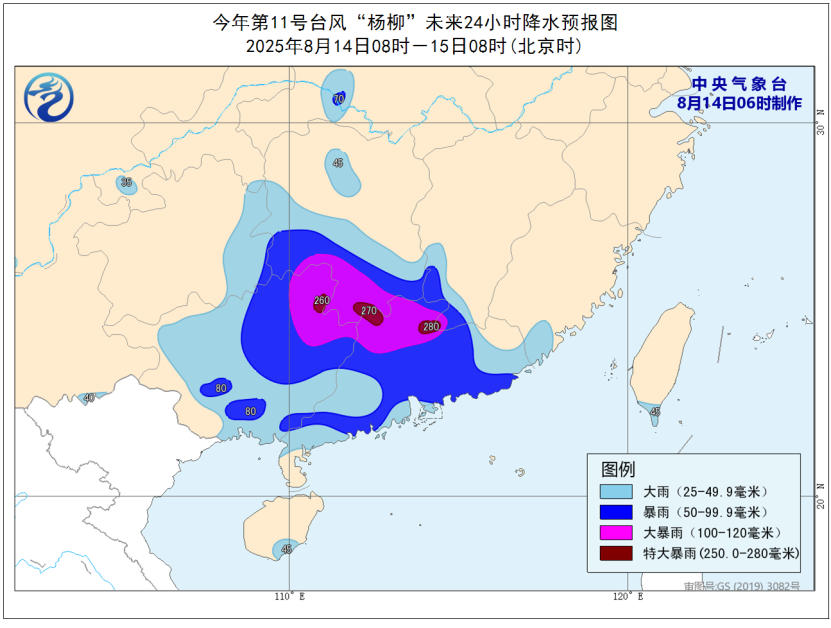 預(yù)計,8月14日08時至15日08時,廣東大部、廣西大部、福建東南部、江西南部、湖南中南部和西北部、貴州東部等地有大到暴雨,部分地區(qū)大暴雨,其中,廣東北部、廣西東北部、湖南南部、江西西南部等地局地有特大暴雨(250~280毫米)。上述部分地區(qū)伴有短時強降水(最大小時降雨量20~50毫米,局地可超過70毫米),局地有雷暴大風等強對流天氣。