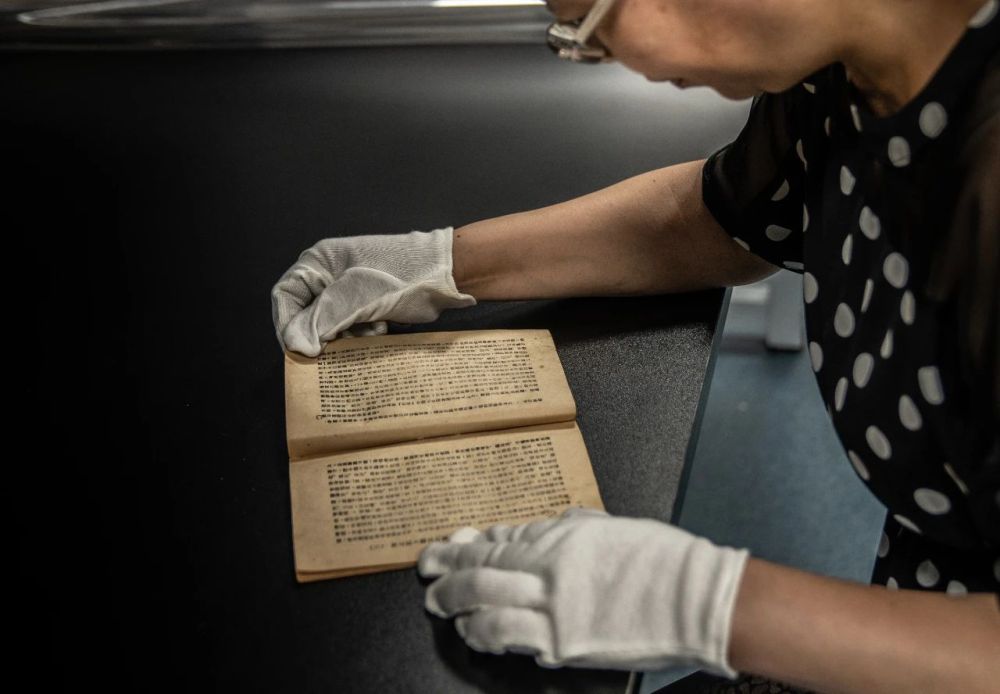 8月4日,遼沈戰(zhàn)役紀(jì)念館工作人員展示館內(nèi)收藏的穆青同志采寫(xiě)的《東北抗日聯(lián)軍斗爭(zhēng)史略》。(遼沈戰(zhàn)役紀(jì)念館供圖)