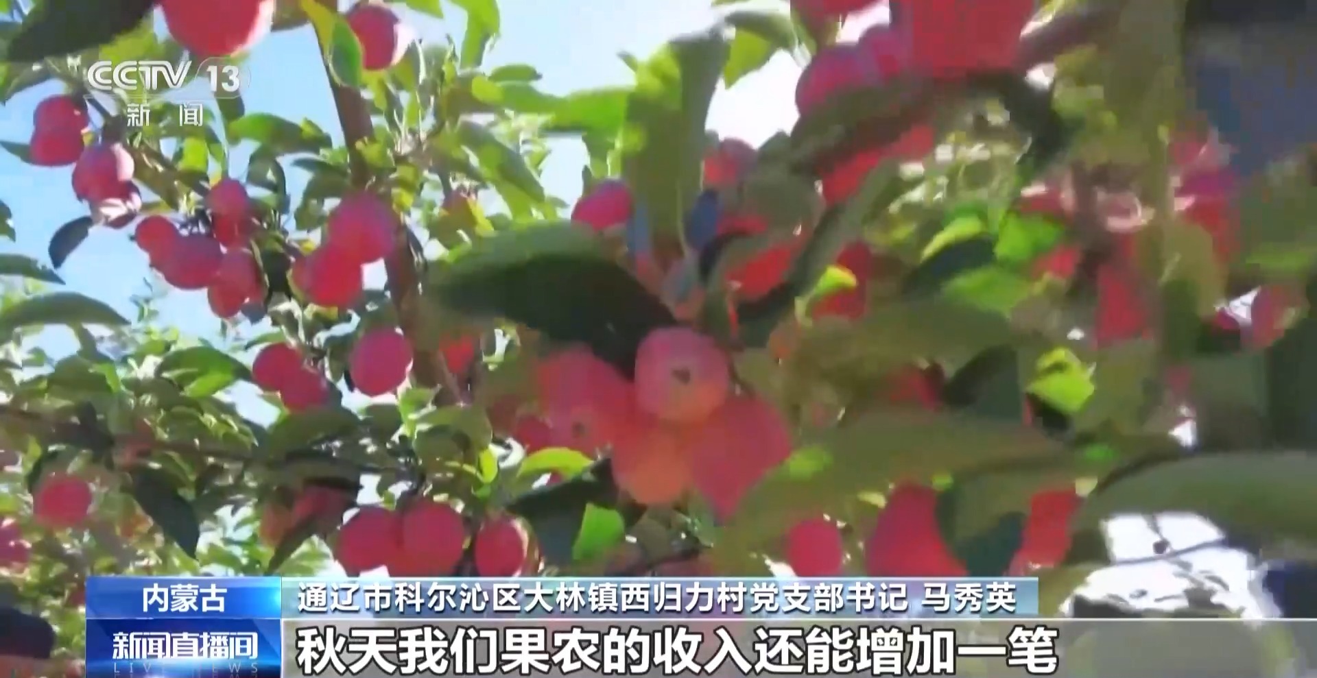 通遼市科爾沁區(qū)大林鎮(zhèn)西歸力村黨支部書(shū)記 馬秀英:今年的果長(zhǎng)得特別好,我們引進(jìn)了深加工,秋天我們果農(nóng)的收入還能增加一筆。