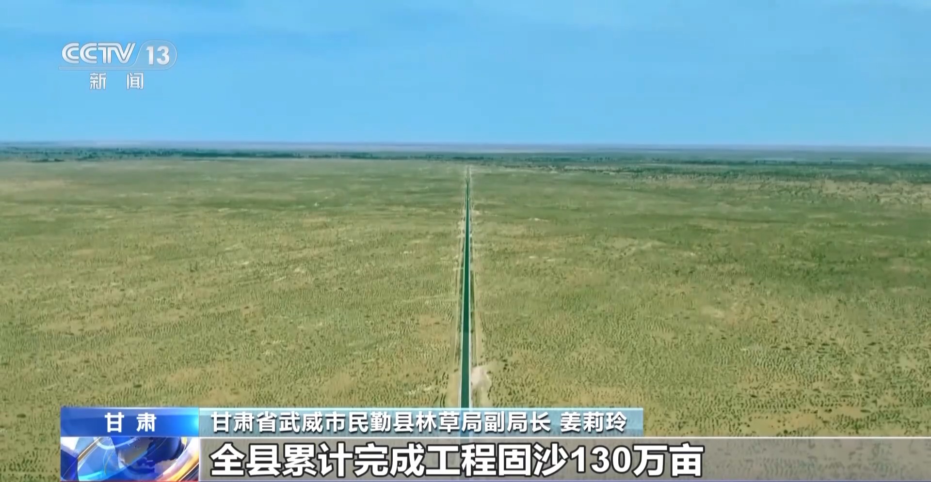甘肅省武威市民勤縣林草局副局長(zhǎng) 姜莉玲:截至目前,全縣累計(jì)完成工程固沙130萬(wàn)畝,封沙育林草325萬(wàn)畝,人工造林保存面積261萬(wàn)畝。