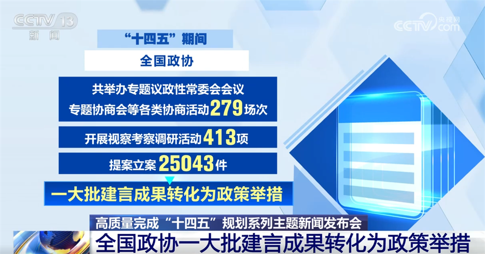 “十四五”期間,全國政協(xié)共舉辦專題議政性常委會會議、專題協(xié)商會等各類協(xié)商活動279場次,開展視察考察調(diào)研活動413項(xiàng),提案立案25043件,一大批建言成果轉(zhuǎn)化為政策舉措。