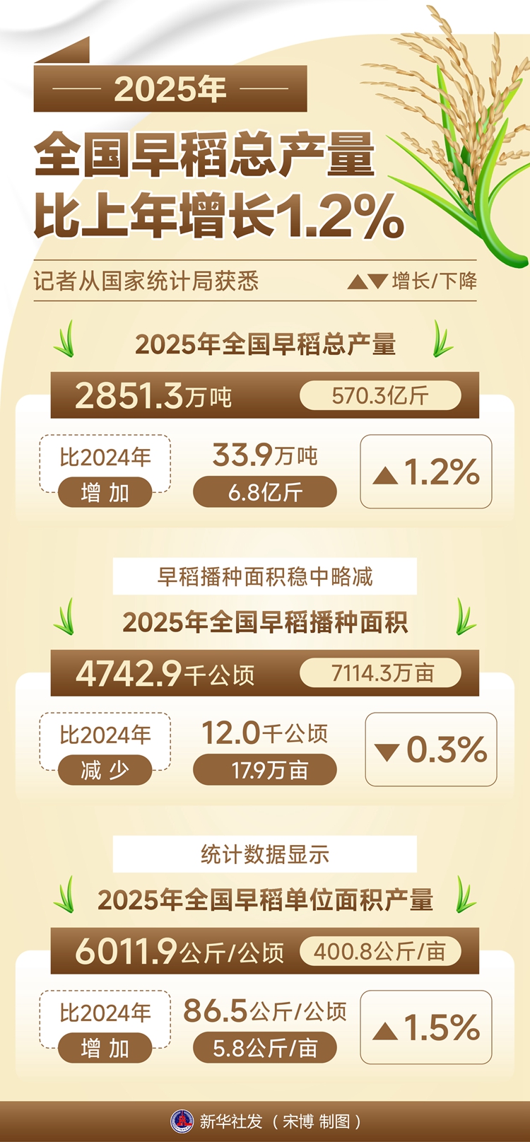記者從國家統(tǒng)計(jì)局獲悉,2025年全國早稻總產(chǎn)量2851.3萬噸(570.3億斤),比2024年增加33.9萬噸(6.8億斤),增長1.2%。