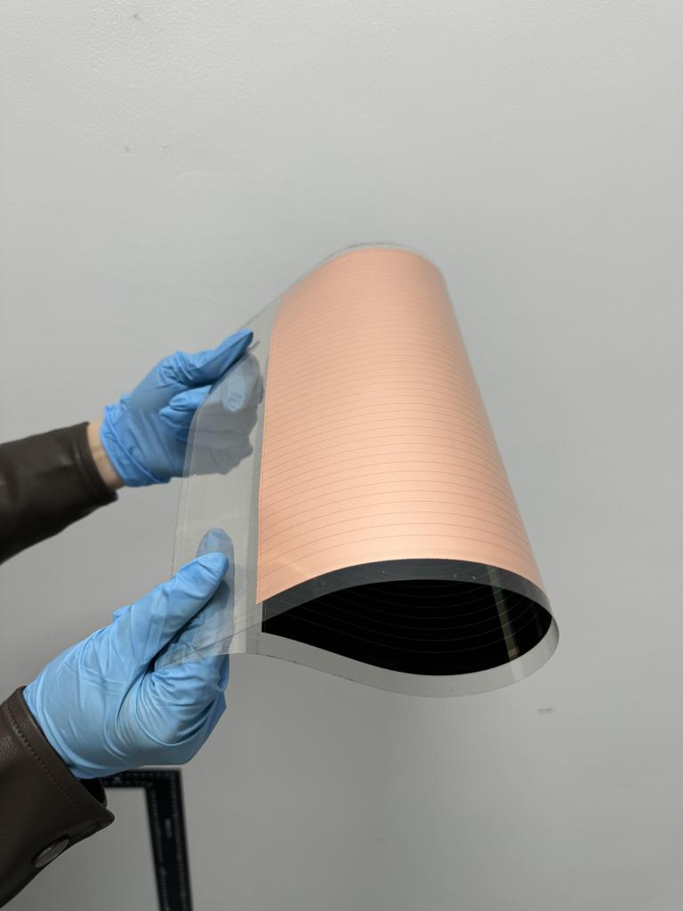 今年,校企聯(lián)合團隊成功將原位涂層技術(shù)轉(zhuǎn)移到工業(yè)級狹縫涂布設(shè)備上,實現(xiàn)寬帶隙鈣鈦礦薄膜在800多平方厘米的柔性基板上一次成型。