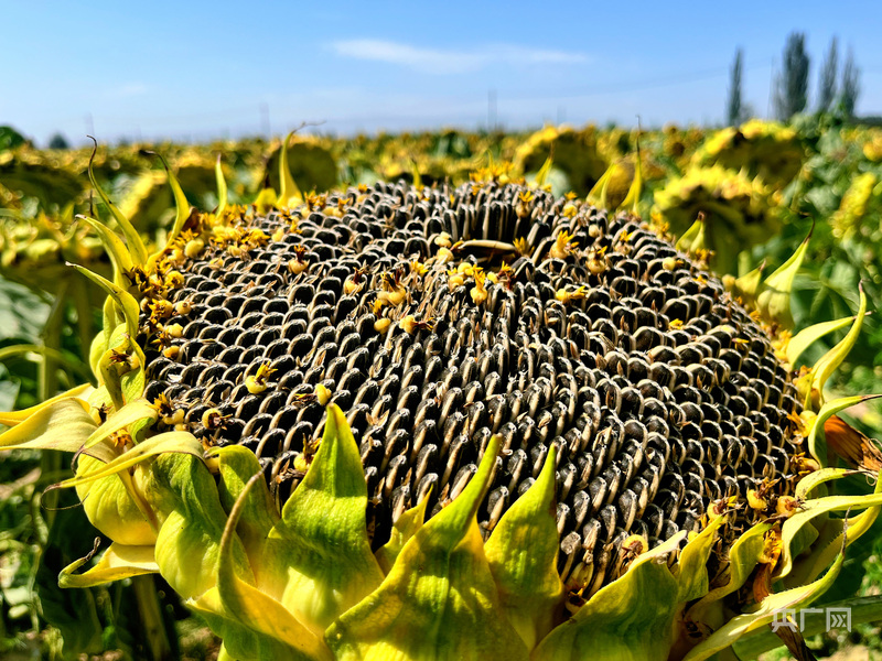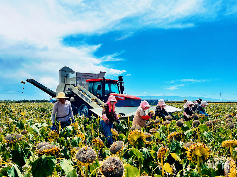 在這片萬畝連片種植區(qū),種植戶王多寶正帶領(lǐng)工人切割葵盤、插桿晾曬。“今年天氣好,葵花長勢特別旺,籽粒又大又亮,產(chǎn)量肯定差不了?!北M管汗水浸濕衣衫,喜悅卻洋溢在他的臉龐。