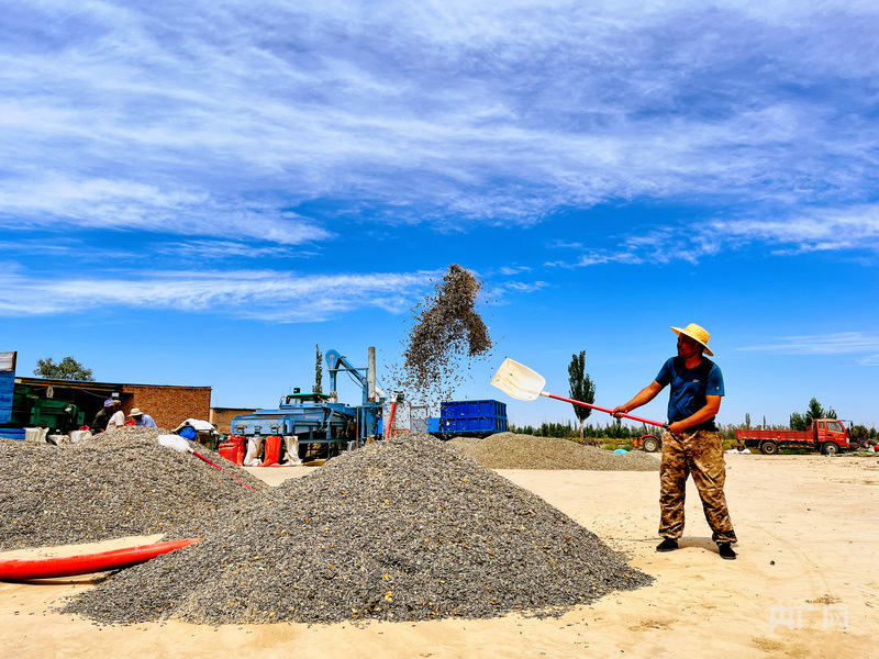農(nóng)民在藍(lán)天下奮力鏟揚(yáng)作物,豐收的喜悅在堆場彌漫(央廣網(wǎng)發(fā) 徐曉瑤 攝)