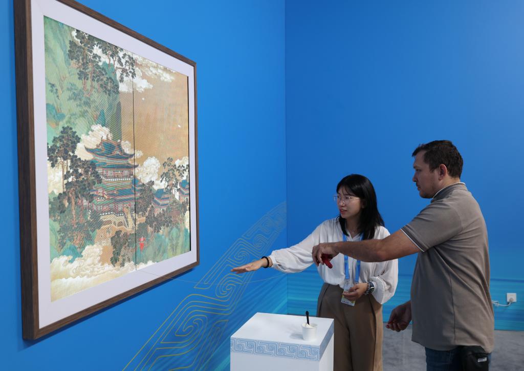 外國記者在體驗“紙鳶漫游”數(shù)字語境項目。新華社記者楊青攝