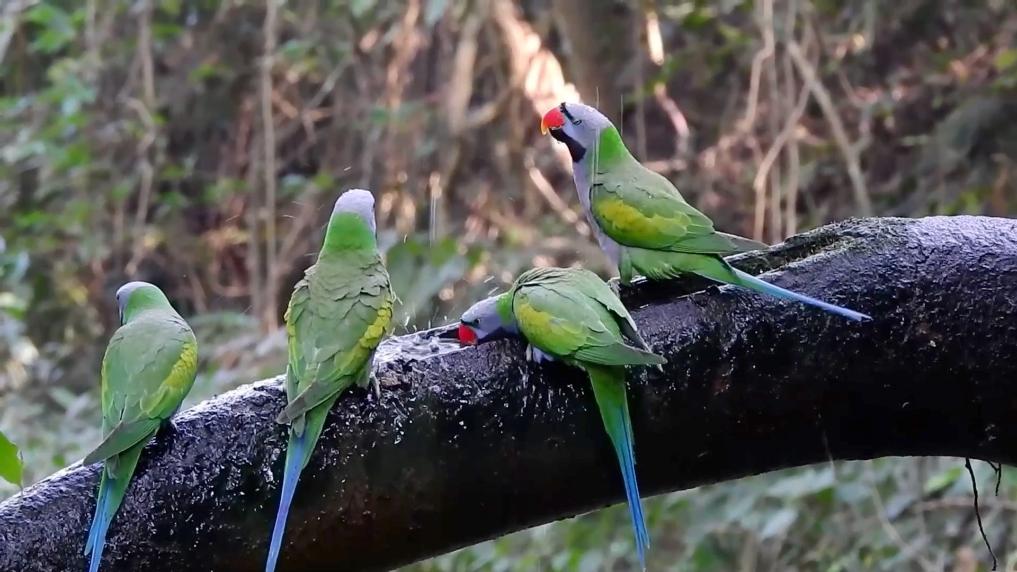 近日,在云南省普洱市思茅區(qū)思茅港鎮(zhèn)茨竹林村芒壩村民小組,成群的國家二級保護動物大紫胸鸚鵡飛臨村子周圍的榕樹嬉戲。