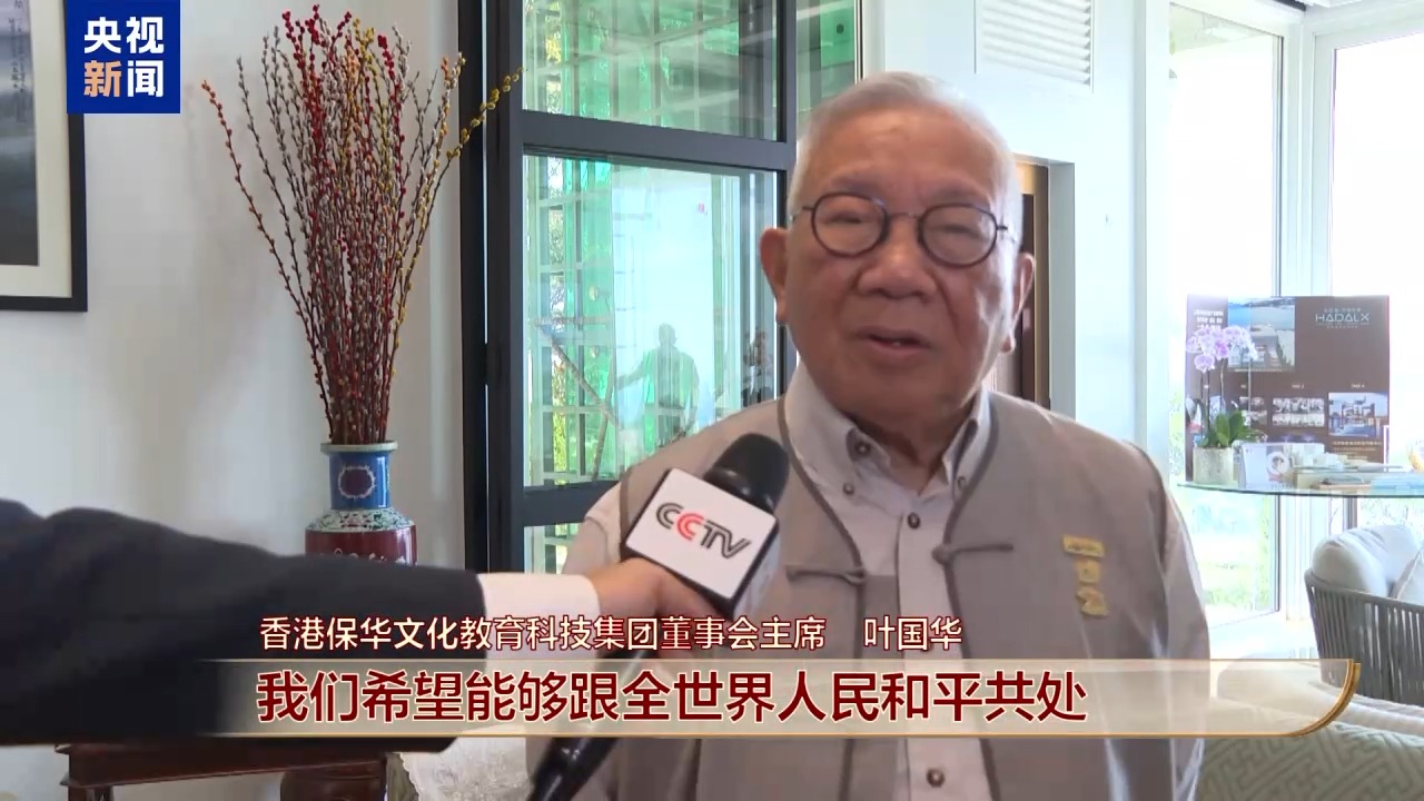 香港保華文化教育科技集團(tuán)董事會主席 葉國華:我一般看電視都坐著。今天我不是坐著而是站著。因為我用最尊敬的心來看。習(xí)近平主席講話精神是,我們希望能夠跟全世界人民和平共處,能夠以構(gòu)建人類命運共同體來帶動全球。