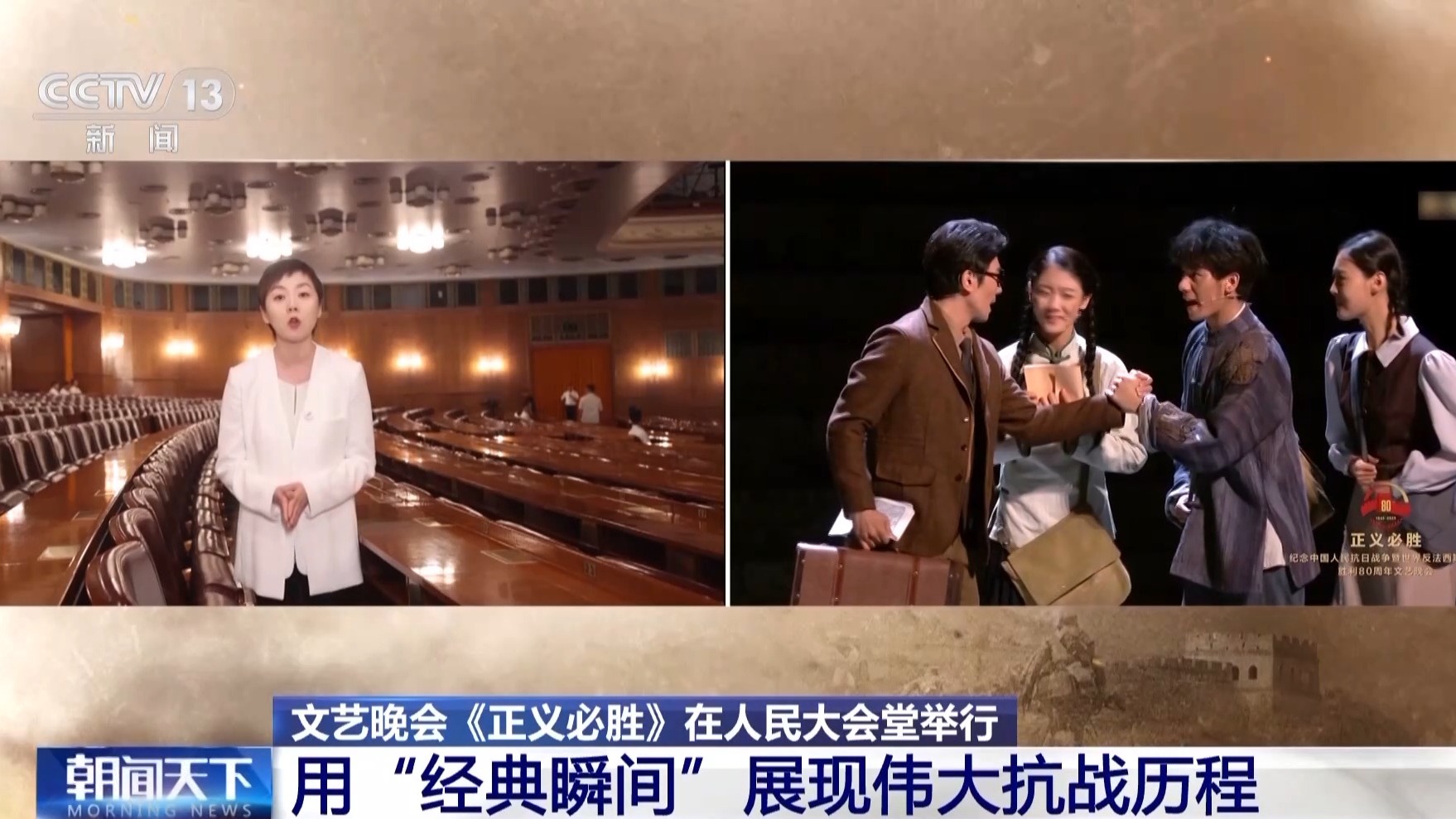 3日晚,紀(jì)念中國(guó)人民抗日戰(zhàn)爭(zhēng)暨世界反法西斯戰(zhàn)爭(zhēng)勝利80周年文藝晚會(huì)《正義必勝》在人民大會(huì)堂舉行。