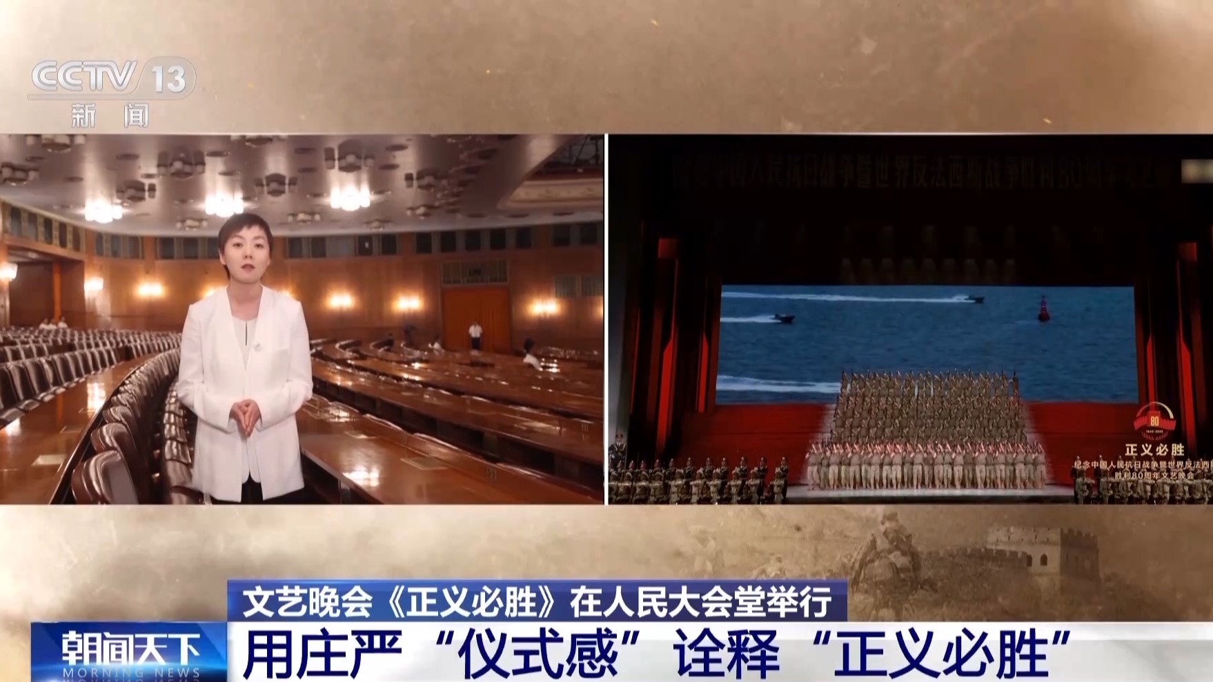 總臺(tái)央視記者 曹巖:從八月起我們一直在現(xiàn)場(chǎng)跟蹤記錄抗戰(zhàn)勝利80周年紀(jì)念晚會(huì)的排練,我個(gè)人覺(jué)得這場(chǎng)晚會(huì)最大的特征,就是在里面我們看到的不是一個(gè)又一個(gè)的獨(dú)立節(jié)目,而是一整部的情景史詩(shī)劇。