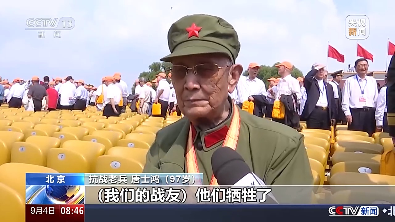抗戰(zhàn)老兵 唐士鴻:我們的戰(zhàn)友他們犧牲了,沒有看到今天的勝利?,F(xiàn)在中國(guó)人民解放軍能夠戰(zhàn)勝一切的敵人,叫戰(zhàn)友在地下安息。前一代人故去了,下一代或者多代要把接力棒接下來繼續(xù)戰(zhàn)斗。不要戰(zhàn)爭(zhēng),不要打仗,要過和平的生活。
