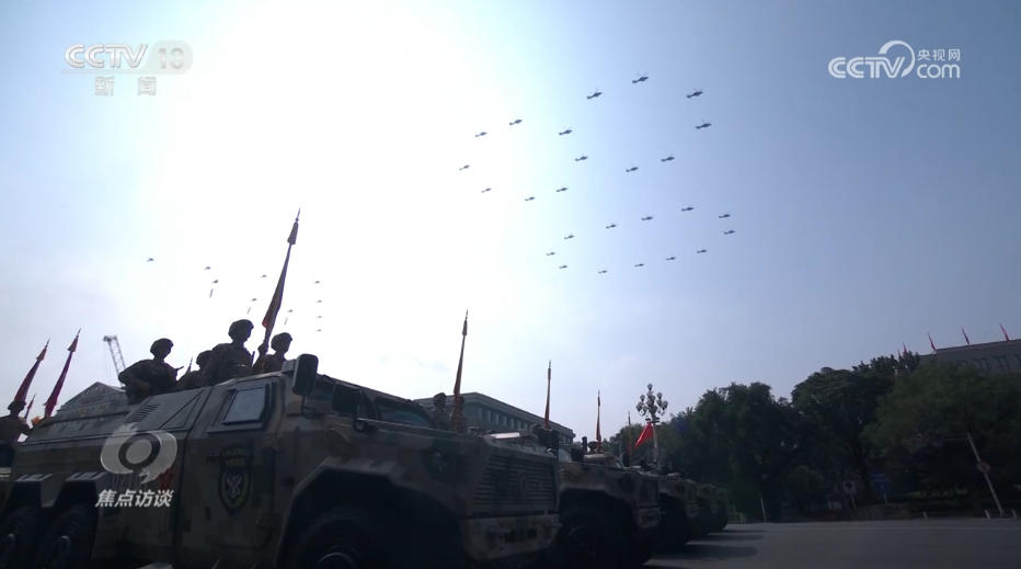 藍天之上,轟鳴聲持久不息,由26架直-19型武裝直升機組成的“80”字樣編隊向天安門飛來,寓意紀念中國人民抗日戰(zhàn)爭暨世界反法西斯戰(zhàn)爭勝利80周年。