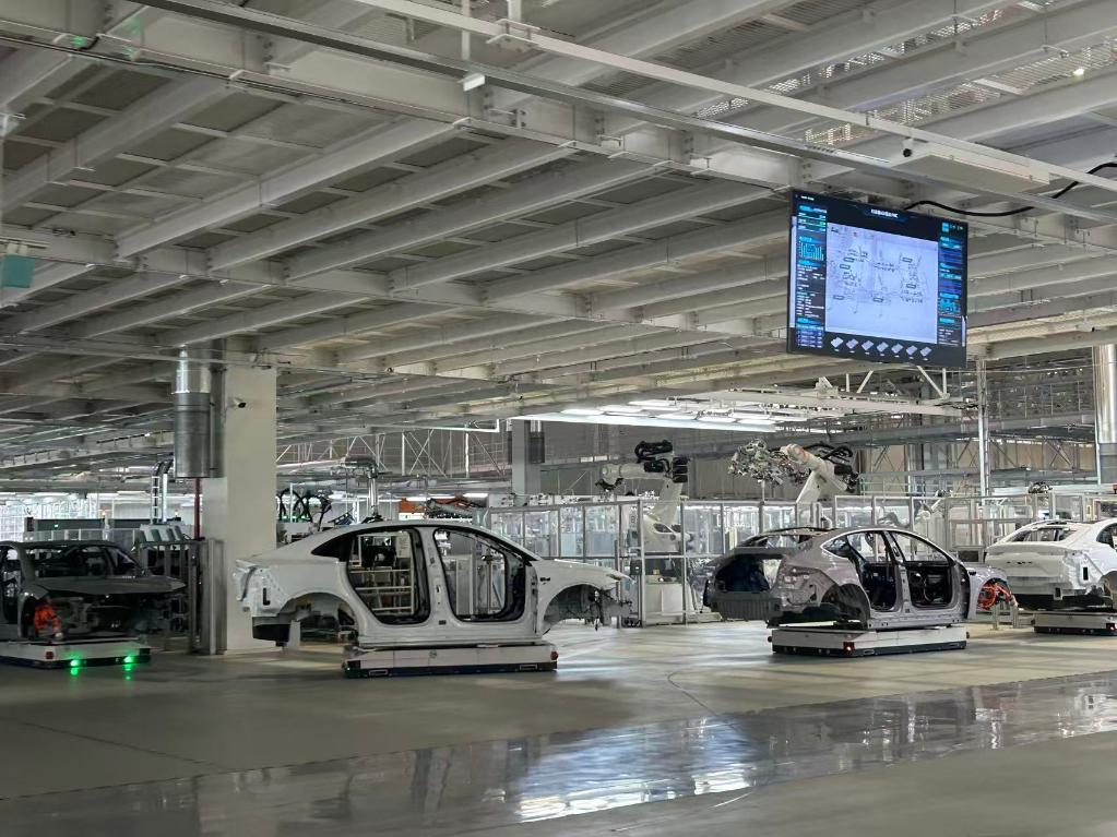 合肥市新橋智能電動(dòng)汽車產(chǎn)業(yè)園蔚來第二工廠內(nèi)拍攝的新能源汽車生產(chǎn)線。新華社記者吳慧珺 攝