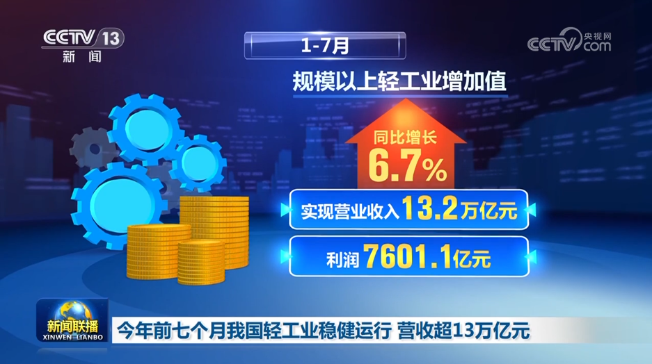 中國輕工業(yè)聯(lián)合會數(shù)據(jù)顯示,今年前七個月,在擴(kuò)內(nèi)需、促消費(fèi)政策支持下,我國輕工業(yè)運(yùn)行穩(wěn)健,生產(chǎn)、營收、市場規(guī)模均保持良好態(tài)勢。規(guī)模以上輕工業(yè)增加值同比增長6.7%,實(shí)現(xiàn)營業(yè)收入13.2萬億元、利潤7601.1億元。