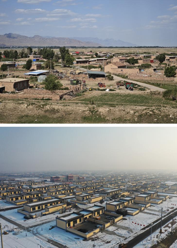 拼版照片:上圖為2023年6月8日拍攝的田家圪旦村拆除前村貌(新華社記者賈立君攝);下圖為2024年2月7日拍攝的田家圪旦新村村貌(無人機(jī)照片,新華社記者李志鵬攝)。新華社發(fā)