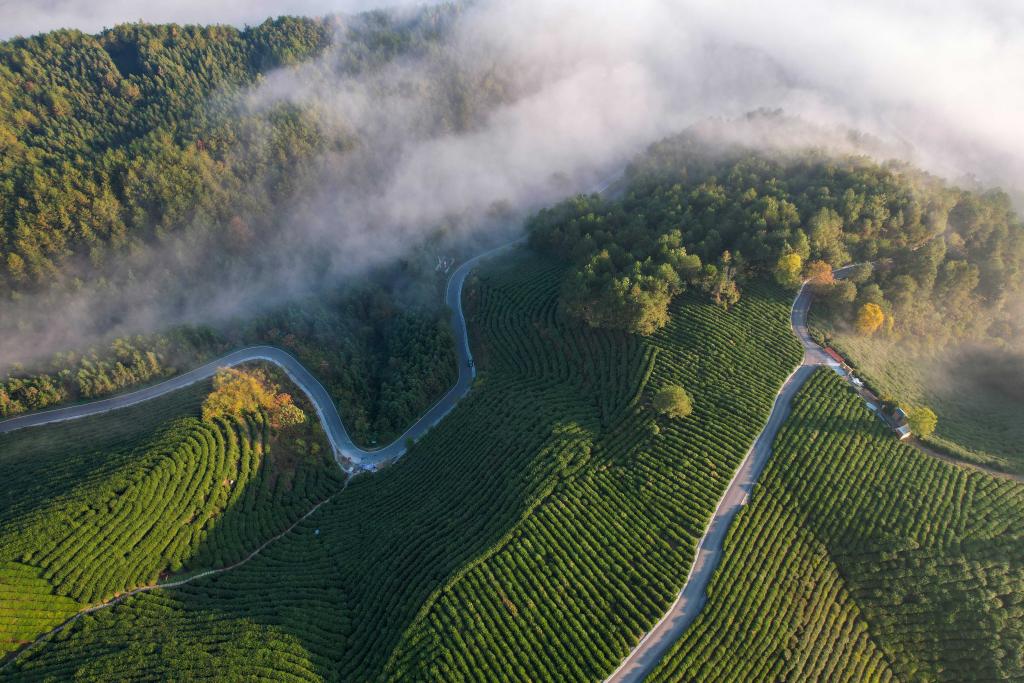 2024年11月8日拍攝的位于安徽省宣城市旌德縣三溪鎮(zhèn)的農(nóng)村公路(無人機(jī)照片)。新華社記者 曹力 攝