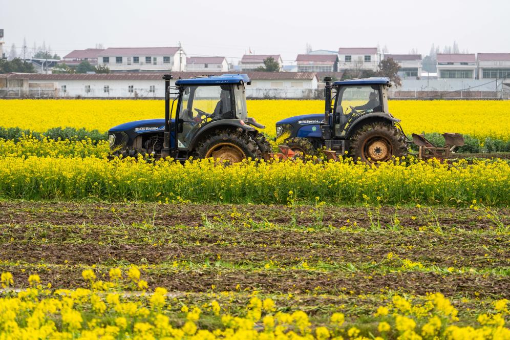 2025年2月25日,在沅江市草尾鎮(zhèn)樂園村,村民操作旋耕機(jī)翻耕芥蘭綠肥。新華社記者 陳思汗 攝