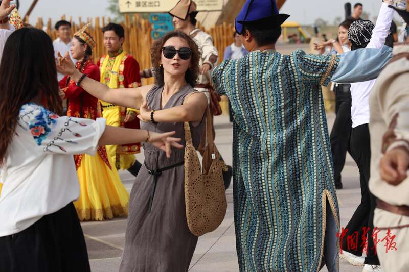 9月9日,新疆巴州尉犁縣羅布人村寨景區(qū),游客和當?shù)匮輪T一起跳舞。羅布人村寨集沙漠、河流、湖泊、森林、草原等自然景觀與獨特的羅布淖爾民俗文化景觀于一體,是外地游客體驗新疆風情的重要一站,深受人們喜愛。中青報·中青網(wǎng)記者 王鑫昕/攝