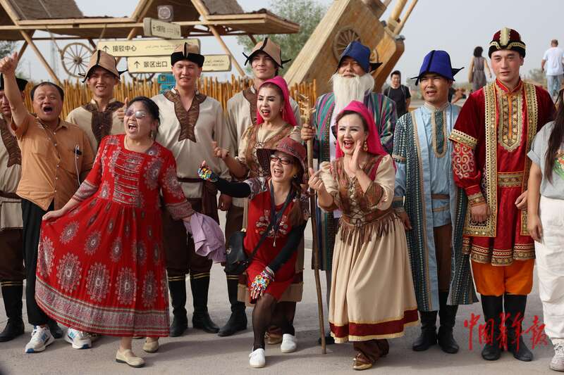 9月9日,新疆巴州尉犁縣羅布人村寨景區(qū),一場演出結(jié)束后,游客和當?shù)匮輪T合影留念。中青報·中青網(wǎng)記者 王鑫昕/攝