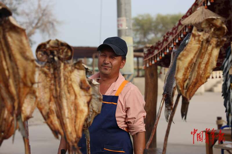 9月9日,新疆巴州尉犁縣羅布人村寨景區(qū),一位店主在現(xiàn)烤草魚。在尉犁縣,羅布人村寨在旅游扶貧、旅游惠民、旅游興縣等方面發(fā)揮著龍頭作用,景區(qū)從業(yè)人員80%以上是當?shù)剞r(nóng)牧民。中青報·中青網(wǎng)記者 王鑫昕/攝
