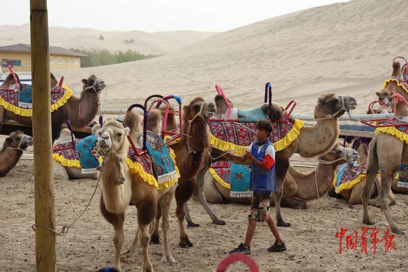 9月9日,新疆巴州尉犁縣羅布人村寨景區(qū),供游客乘騎的駱駝。中青報·中青網(wǎng)記者 王鑫昕/攝