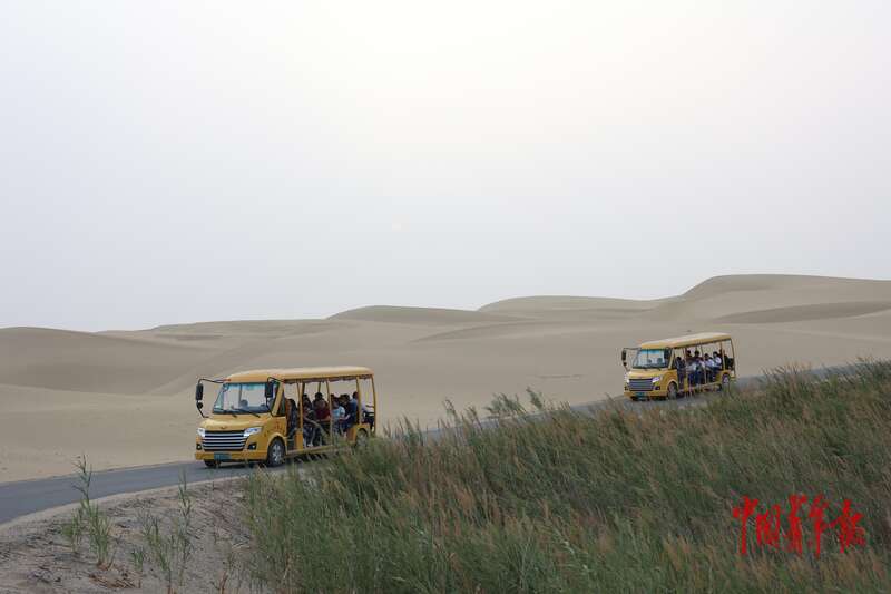 9月9日,新疆巴州尉犁縣羅布人村寨景區(qū),觀光車行進在塔克拉瑪干沙漠中。中青報·中青網(wǎng)記者 王鑫昕/攝