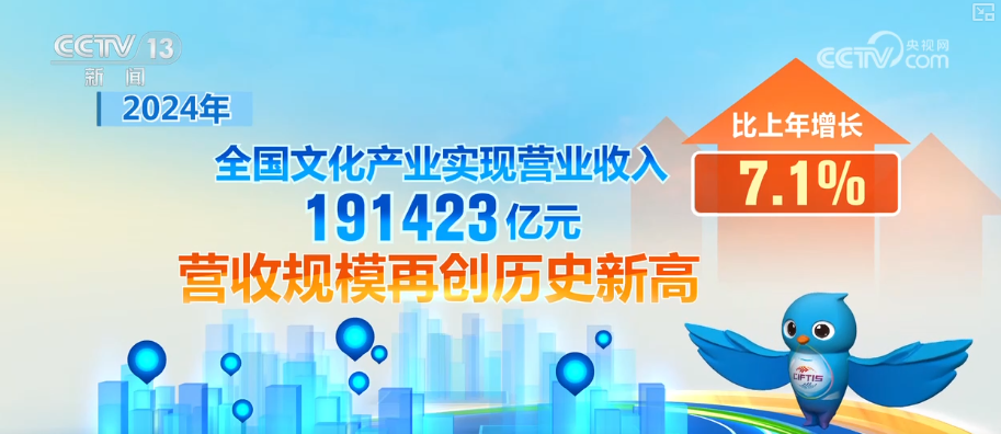 2024年,全國文化產(chǎn)業(yè)實現(xiàn)營業(yè)收入191423億元,營收規(guī)模再創(chuàng)歷史新高,比上年增長7.1%。2024年,文化服務業(yè)實現(xiàn)營業(yè)收入109134億元,比上年增長7.4%,占全部文化產(chǎn)業(yè)營業(yè)收入的比重為57.0%,文化服務業(yè)對文化產(chǎn)業(yè)營業(yè)收入增長的貢獻率為59.1%。