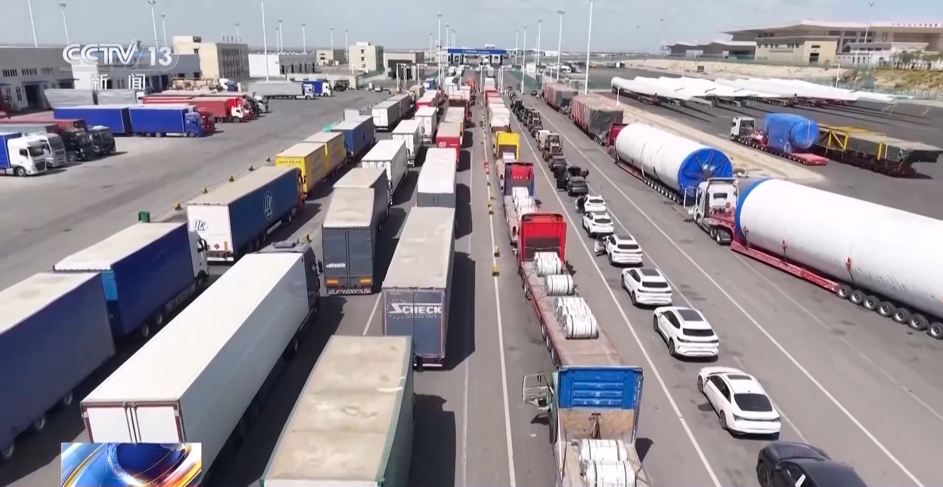 總臺(tái)央視記者 李廈:這里是霍爾果斯公路口岸,看我身邊龐大的車流,不僅有滿載跨境包裹的大貨車、更是有一眼望不到頭的國(guó)產(chǎn)新能源車和農(nóng)用機(jī)械車輛,甚至還有長(zhǎng)達(dá)數(shù)十米的風(fēng)機(jī)葉片,這些琳瑯滿目的中國(guó)好貨,正在24小時(shí)不停歇地從這條黃金大通道駛出國(guó)門。