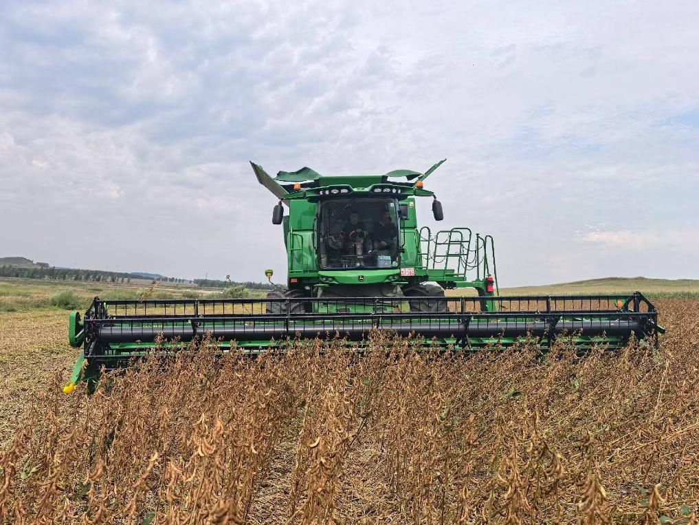 在黑龍江省七臺河市勃利縣恒山玉米專業(yè)合作社的一處地塊,一臺臺大型收割機往來穿梭,一排排飽滿的大豆植株被精準卷入機身,金黃的豆粒隨即通過出糧口涌入運糧車。