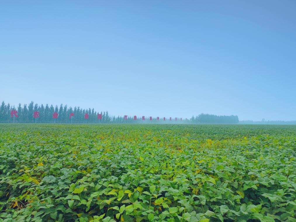 在山東省濟寧市嘉祥縣國家現(xiàn)代農(nóng)業(yè)產(chǎn)業(yè)園大豆原種繁育基地,一片片大豆長勢喜人。(受訪者供圖)