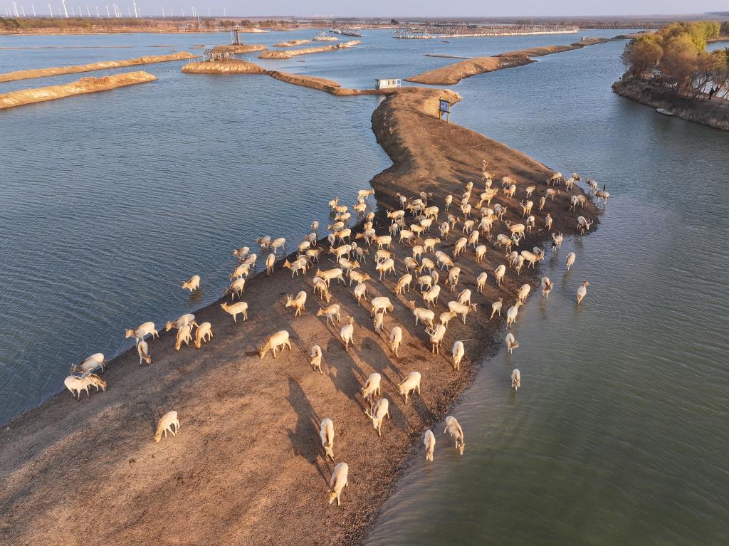 2024年12月21日在大豐野鹿蕩拍攝的麋鹿(無人機照片)。新華社記者 季春鵬 攝