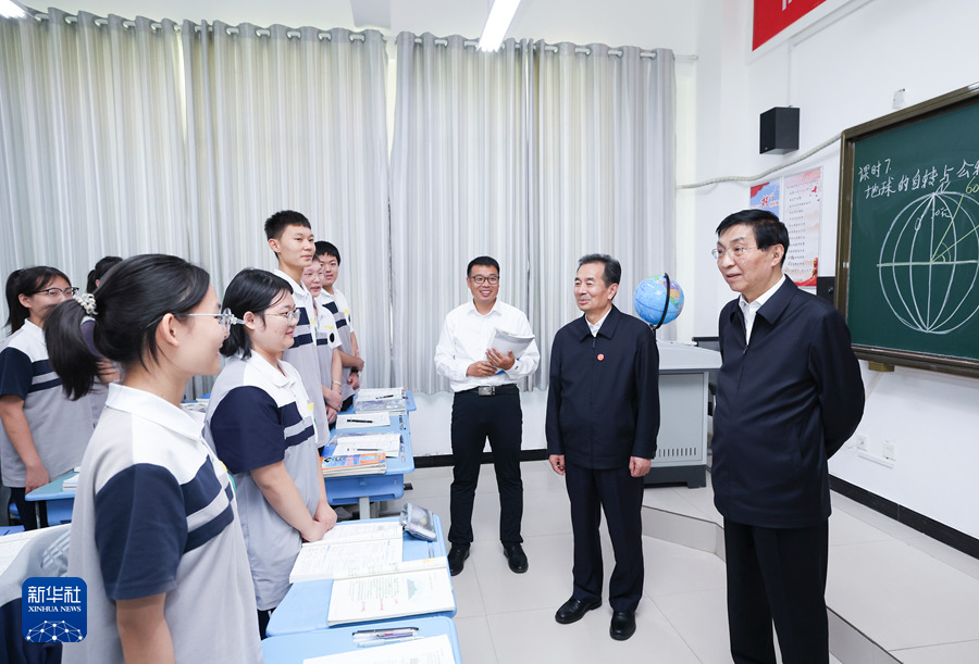 9月25日下午,受習(xí)近平總書記囑托,中共中央政治局常委、全國(guó)政協(xié)主席、中央代表團(tuán)團(tuán)長(zhǎng)王滬寧帶領(lǐng)中央代表團(tuán)部分成員在巴音郭楞蒙古自治州庫(kù)爾勒市看望慰問(wèn)當(dāng)?shù)馗髯甯刹咳罕?。這是王滬寧和中央代表團(tuán)部分成員在庫(kù)爾勒市第二十三中學(xué)考察教育援疆情況。新華社記者 姚大偉 攝