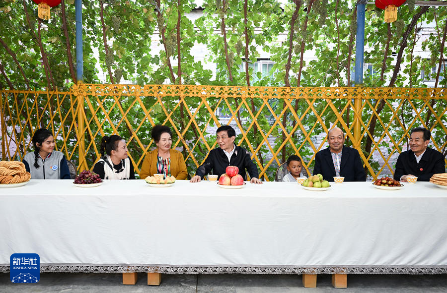 9月25日下午,受習(xí)近平總書記囑托,中共中央政治局常委、全國(guó)政協(xié)主席、中央代表團(tuán)團(tuán)長(zhǎng)王滬寧帶領(lǐng)中央代表團(tuán)部分成員在巴音郭楞蒙古自治州庫(kù)爾勒市看望慰問(wèn)當(dāng)?shù)馗髯甯刹咳罕?。這是王滬寧和中央代表團(tuán)部分成員在庫(kù)爾勒市阿瓦提鄉(xiāng)吾夏克鐵熱克村了解鄉(xiāng)村產(chǎn)業(yè)發(fā)展和群眾生產(chǎn)生活情況。新華社記者 張領(lǐng) 攝