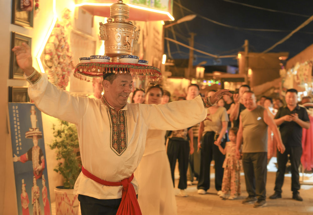 夜幕降臨,煙火氣息在庫車?yán)铣菑浡V場(chǎng)上傳來歡快的樂曲聲,舞者頭頂銅盤銅壺,腳步輕快,將迎賓之禮——薩瑪瓦爾舞展現(xiàn)在游客面前,掌聲與歡笑聲此起彼伏。