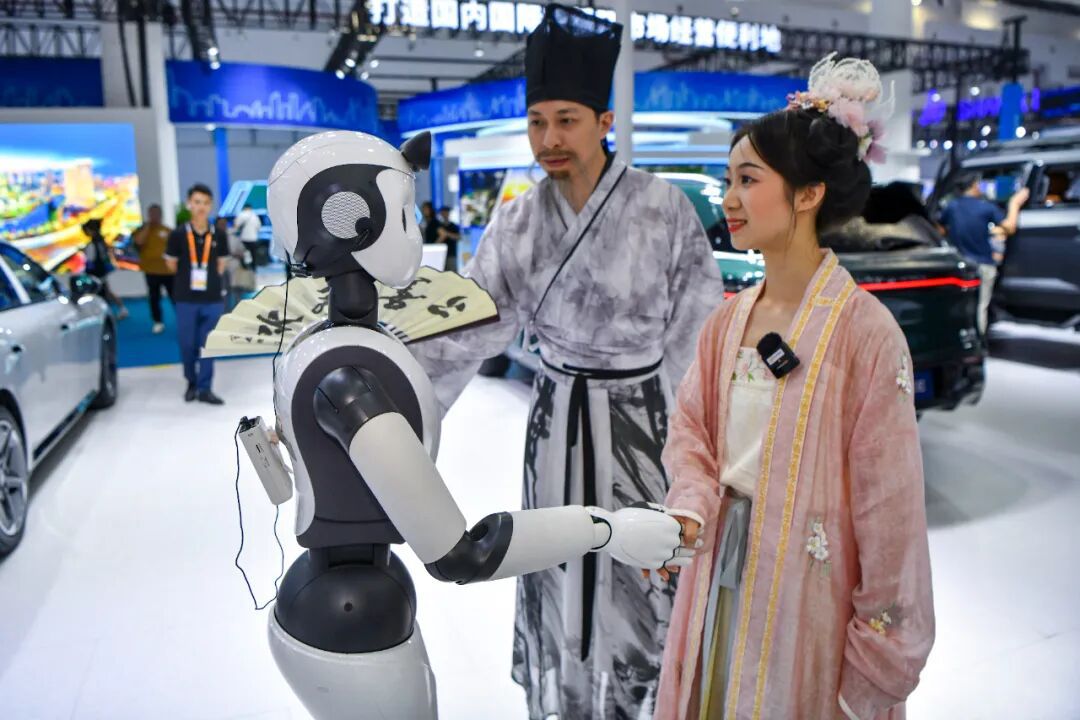 2024年4月15日,海南??冢谒膶弥袊鴩H消費品博覽會上,身著漢服的參觀者與“柔美人形智能服務(wù)機(jī)器人”互動。中新社記者 駱云飛 攝