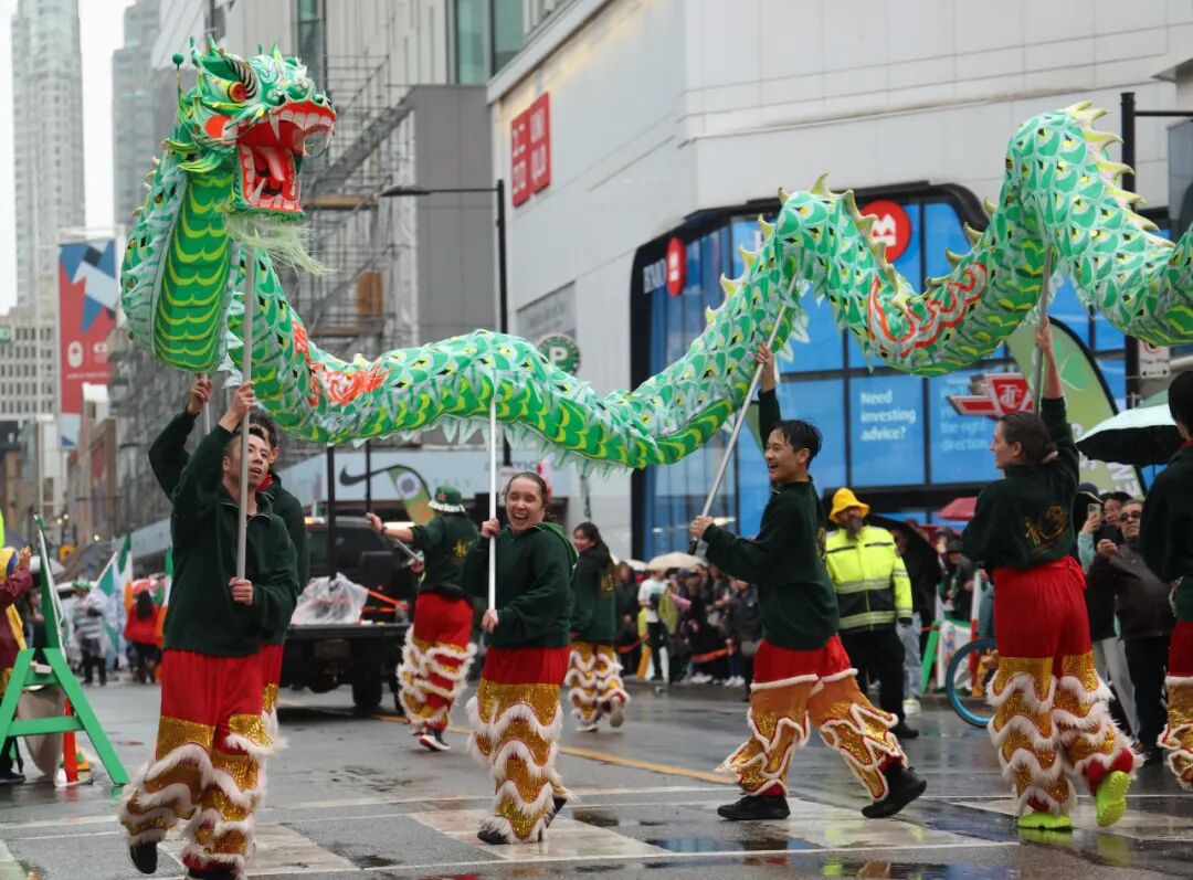 當(dāng)?shù)貢r間2025年3月16日,加拿大多倫多,在慶祝愛爾蘭民族傳統(tǒng)節(jié)日圣帕特里克節(jié)(St. Patrick’s Day)的大游行中,一支中式舞龍隊舞動綠色長龍。中新社記者 余瑞冬 攝