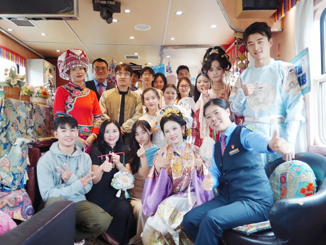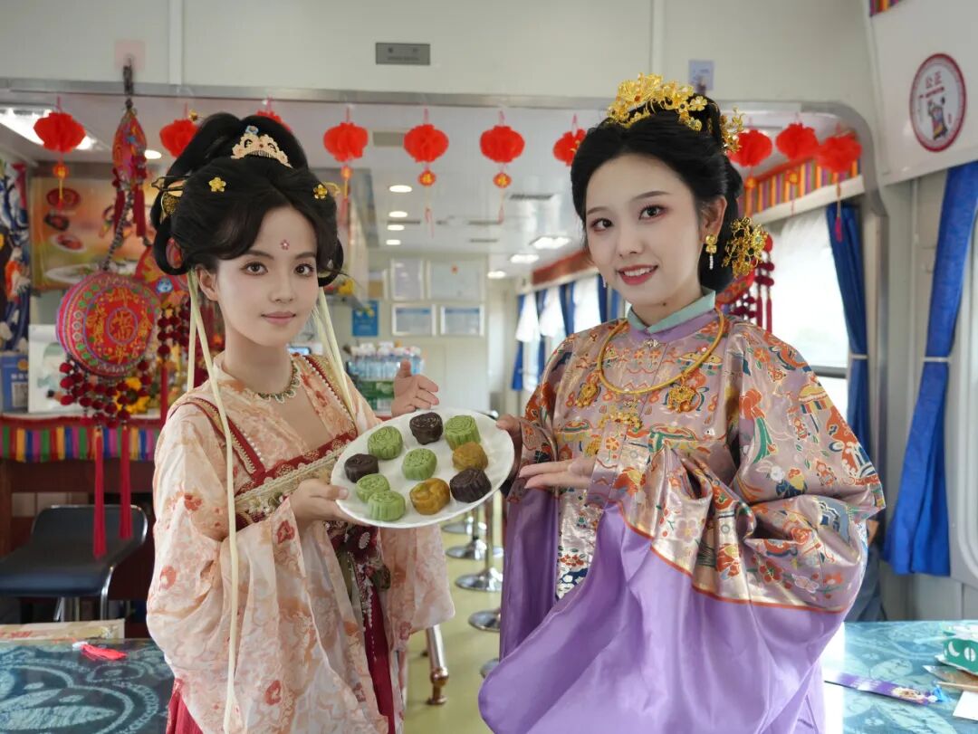 “旅客朋友們,歡迎乘坐本趟列車,中秋佳節(jié)將至,我們?cè)?號(hào)餐車準(zhǔn)備了特色活動(dòng),誠邀大家共慶佳節(jié)!”列車長(zhǎng)李文雯的聲音通過廣播傳遍車廂。隨即《納西三部曲》旋律響起——身著絢麗民族服飾的列車員們,拉著周圍旅客一同跳起納西族舞蹈,歡快的節(jié)奏瞬間點(diǎn)燃車廂氣氛。