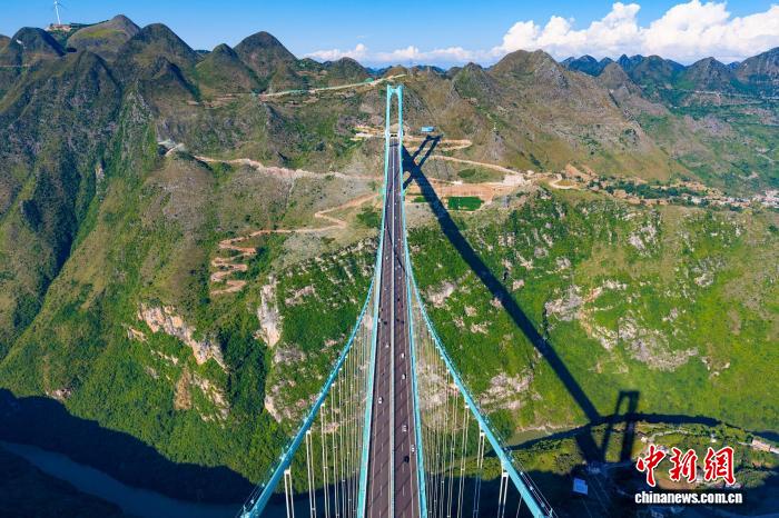 該橋主橋跨徑居山區(qū)橋梁跨徑世界第一、橋梁高度居世界第一。眾多游客慕名前來(lái),或踏上透明玻璃步道體驗(yàn)“云端漫步”,或在大橋觀景平臺(tái)、周邊村寨尋找最佳角度,與這座“橫豎都是世界第一”的大橋合影留念。