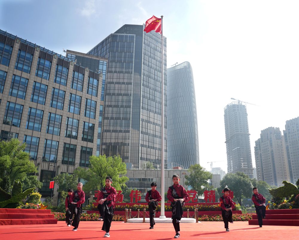 10月1日,在上海中共一大紀(jì)念館前舉行的文藝演出中,小朋友在表演舞蹈《男兒當(dāng)自強(qiáng)》。新華社記者 劉穎 攝