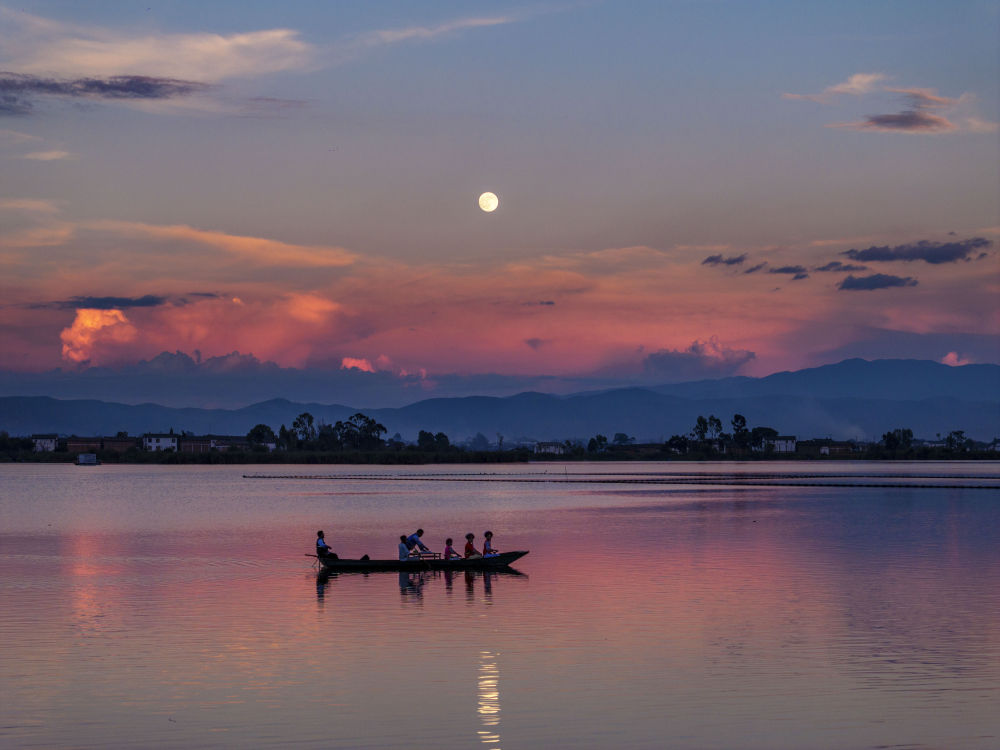 10月6日,人們乘船在云南大理洱源西湖賞月(無人機(jī)照片)。新華社發(fā)(羅新才攝)